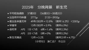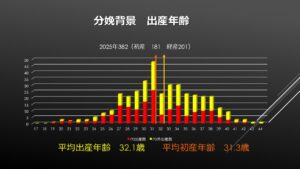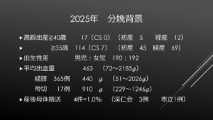 令和7年の分娩背景(産科的側面からの内訳)ですが、35歳以上の高齢出産が30%。出産した産婦さんの平均年齢は32.1歳でしたが、初産婦さんに限ると31.3歳で、当院でも少しずつ初産婦さんの平均年齢が上がっています。