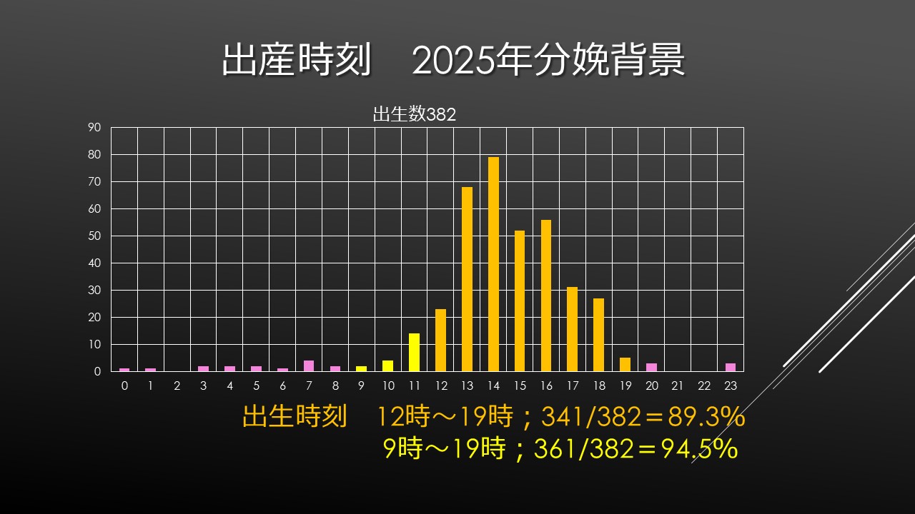 毎年計画分娩の成功度合いの評価として出産時刻を調べてみるのですが、午後の時間帯に集中していて、21時以降の深夜帯の分娩が少なく抑えられていることで、マンパワーの多い時間帯の出産が安全にとって重要な要素と考えている僕としてだいたい満足できる数かと思います。