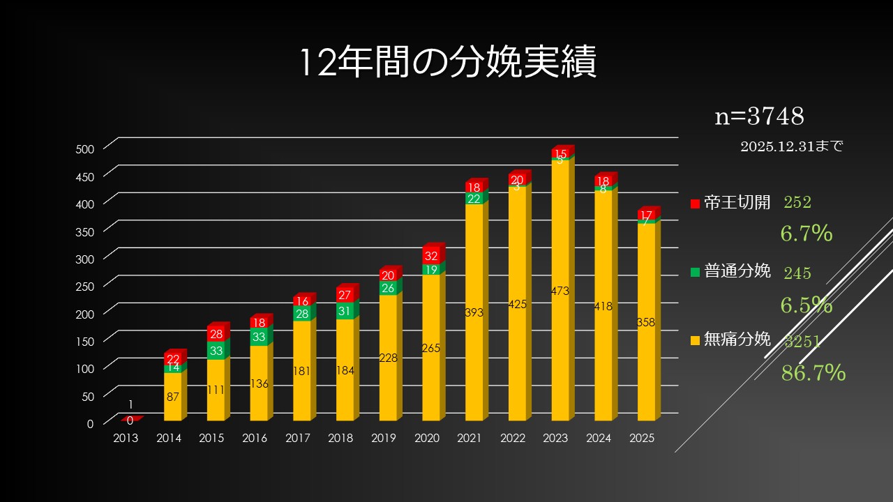 無痛分娩が93.7%で、帝王切開が4.5%、非無痛の経腟分娩は1.8%でした。12年分の合計でもここ5年が90%以上の無痛分娩率なので3748件の分娩中3251件(86.7%)が無痛分娩。帝王切開がここ5年3~4%台なので通算でも6.7%と割合が減ってきています。「麻酔をしてでも経腟分娩をしたい」と思って当院を指名していただいている妊婦さんには出来るだけ経腟分娩できる方策を考えて臨んでいるので、どうしても完璧にとは言えないけど、ある程度実践できているのかと思います。非無痛の経腟分娩は帝王切開とほぼ同等ですが、年々少なくなってきています。