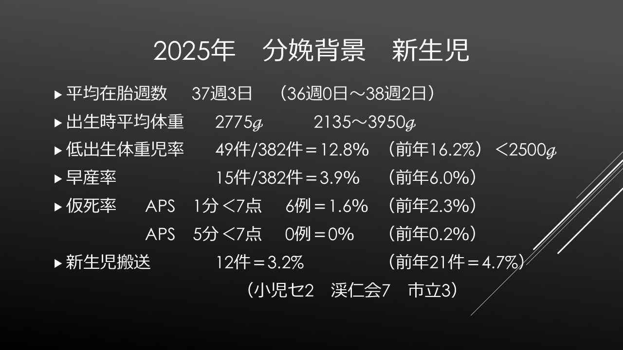 新生児は平均週数が37週3日と予想より早い印象でした。妊娠糖尿病や妊娠高血圧、肥満、低身長などのリスクのある産婦さんは早めの37週過ぎてすぐにでも計画分娩にしているので少し早いのかとも思います。平均体重2775gでした。